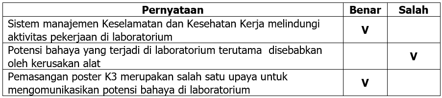 Bahaya merupakan sesuatu yang mengancam pada manusia dan dapat menyebabkan cidera. Salah satu tempat kerja yang memiliki potensi bahaya tinggi adalah laboratorium. Laboratorium adalah tempat yang digunakan untuk melakukan suatu percobaan. Bekerja di laboratorium tidak boleh bertindak ceroboh dalam memperlakukan dan mempergunakan peralatan dan bahan-bahan yang terdapat di laboratorium. Hal itu bertujuan mengurangi kemungkinan terjadinya kecelakaan. Potensi bahaya yang dapat terjadi antara lain bahaya kebakaran, keracunan, dan kerusakan alat.