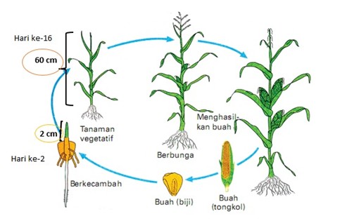 Proses perkecambahan benih jagung terjadi saat terdapat radikula yang muncul dari kulit benih. Proses perkecambahan jagung dimulai saat terjadi penyerapan air yang dilakukan oleh benih yaitu dengan melalui proses ambibisi. Proses ini akan menjadikan benih menjadi bengkak dan akan diikuti oleh peningkatan enzim serta respirasi. Awal perkecambahan jagung yaitu koleoriza akan memanjang dan menembus pericarp, lalu radikula akan menembus koleoriza. Besaran panjang dan waktu dapat digunakan untuk menentukan pertumbuhan tanaman. Secara umum, fase tasseling berlangsung antara 42-52 hari sejak jagung berkecambah. Hal itu ditandai dengan terdapatnya cabang terakhir dari bunga jantan sebelum bunga betina muncul. Tahap ini dimulai sejak 2-3 hari sebelum rambut tongkol muncul