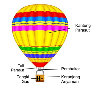 - gerak vertikal balon udara terjadi karena pemanasan burner yang mengakibatkan volume gas helium dalam kantung parasut berubah