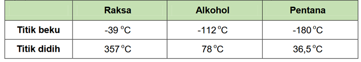 Seorang ilmuwan ingin membuat termometer yang dapat mengukur rentang suhu antara -110 oC sampai dengan 32 oC dengan menggunakan cairan tersebut. Cairan yang dapat digunakan oleh ilmuwan tersebut adalah ….