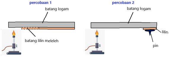 Dua siswa melakukan percobaan berbeda untuk membandingkan kemampuan berbagai logam dalam menghantarkan energi panas. Gambar percobaan yang dilakukan adalah sebagai berikut: