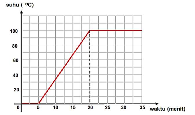 Dalam sebuah percobaan tentang kalor, seorang siswa kelas 7 SMP di kabupaten Sleman memanaskan sejumlah es yang ditempatkan pada sebuah beaker glass. Siswa tersebut kemudian mencatat hasil percobaannya, kemudian membuat grafik seperti gambar berikut.