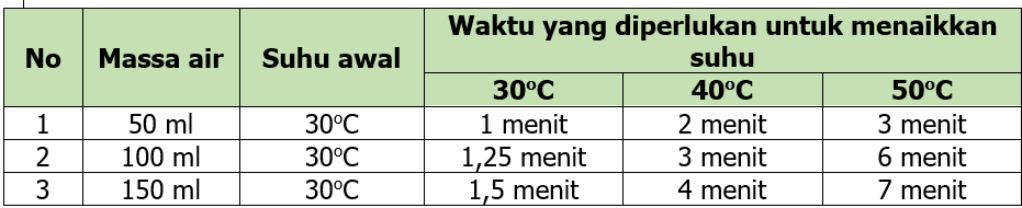 27. Kalor atau energi panas adalah energi yang dapat berpindah dari objek yang bersuhu lebih tinggi ke objek yang bersuhu lebih rendah jika keduanya bertemu atau bersentuhan. Sekelompok peserta didik melakukan percobaan untuk menyelidiki pengaruh kalor terhadap suhu sebuah benda dan massanya. Tabel berikut merupakan hasil percobaan kelompok tersebut.